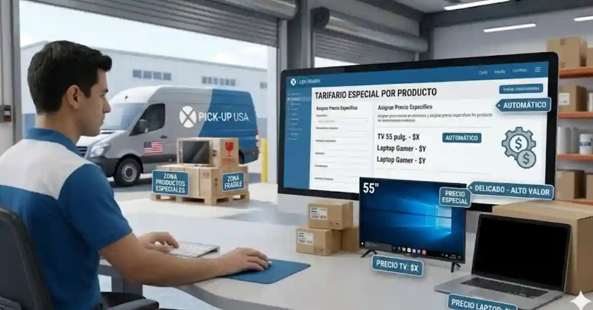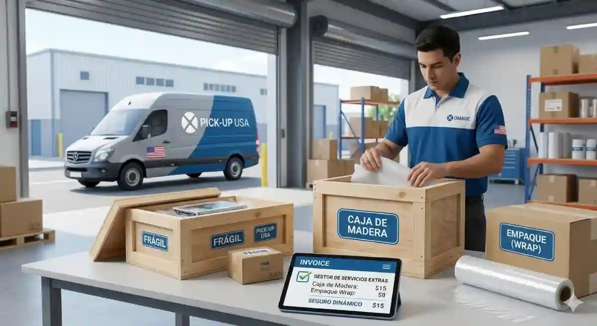 Cobros automatizados por cajas de madera, empaque (Wrap), seguros dinámicos y servicio de Pick-Up en USA.