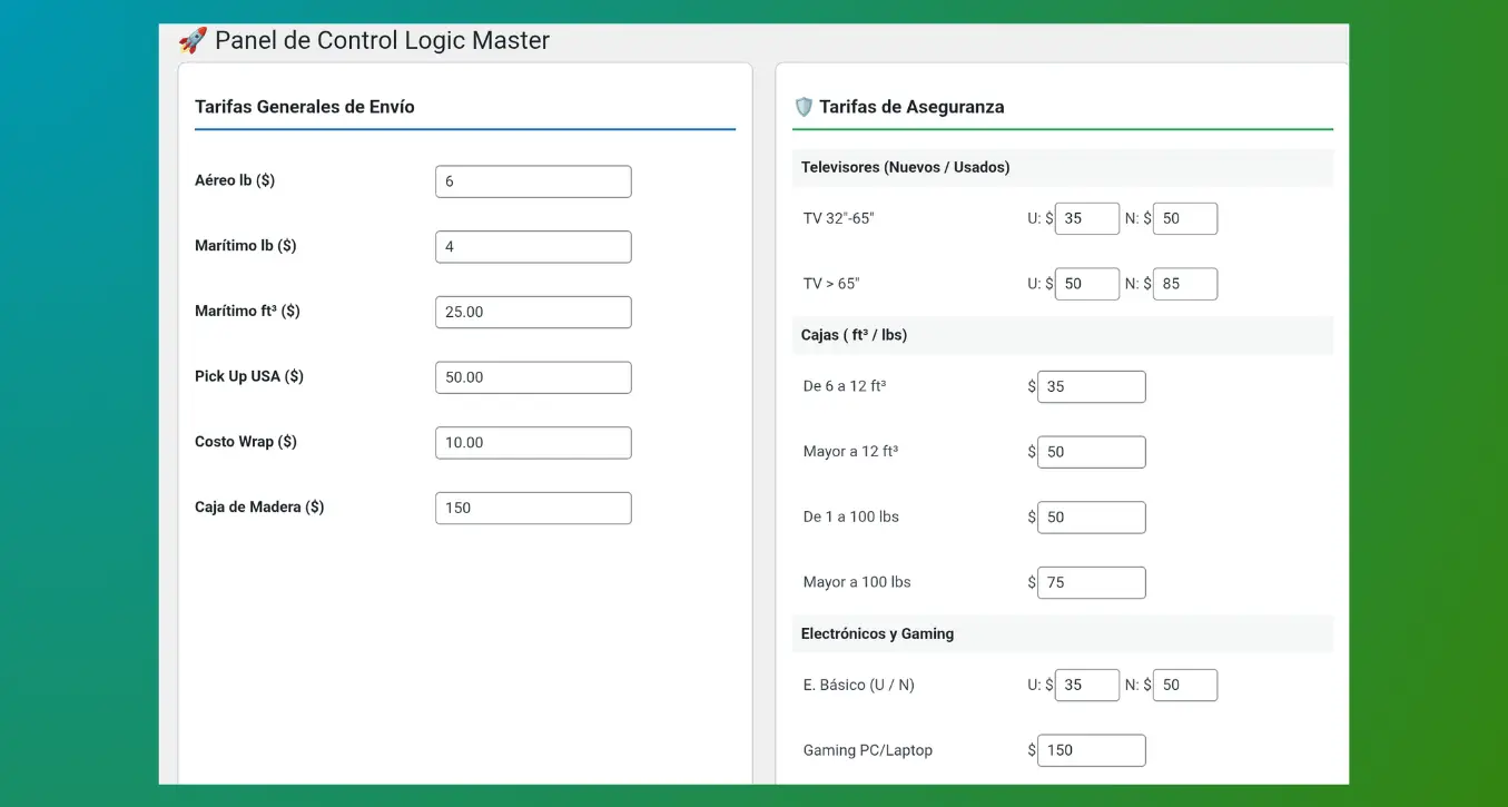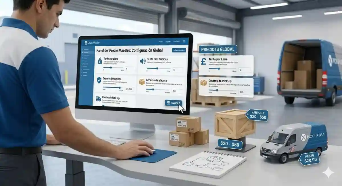 Configura globalmente tarifas de libras, pies cúbicos, seguros, servicios de madera y costos de Pick-Up sin tocar una línea de código.