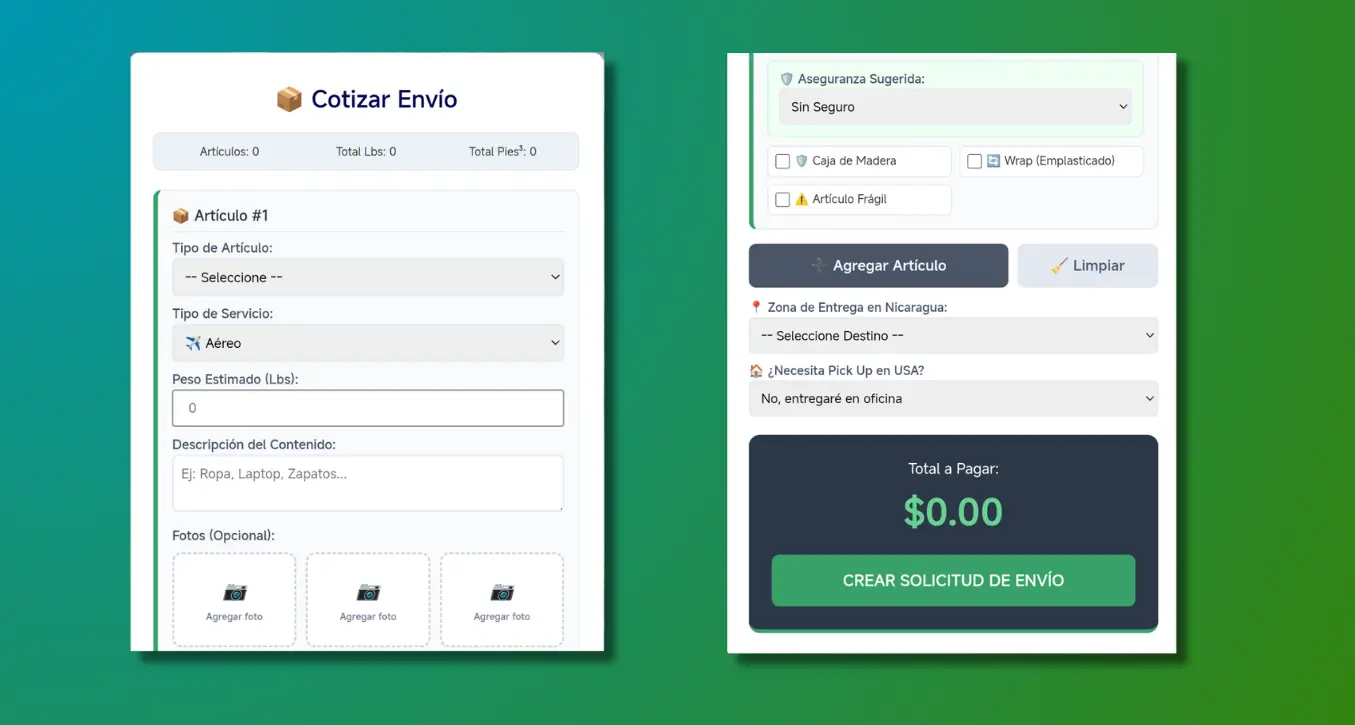 Calcula automáticamente tarifas por libra (Aéreo) y pie cúbico (Marítimo) en una misma solicitud, sin errores manuales.